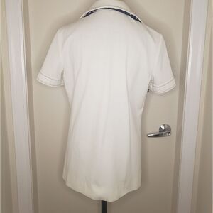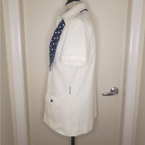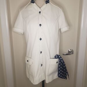 Long creamy White Button-up Sailor style Collared Short Sleeve Shirt Top with Navy Blue Stitching & Bobble Buttons, large front Patch Pockets and matching Polkadot Neck Scarf, by COUNTRY MISS.