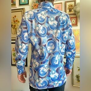 Incredibly groovy early 70s psychedelic op art dagger collar button up shirt in mint condition! No original tags attached but was acquired from liquidation deadstock pieces. Rare to find these amazing time capsule pieces in such condition. Made of medium weight polyester.