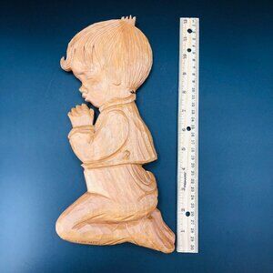 70s Hand Carved Wood Wall Plaque Praying Boy Vintage Gerard Lamonde Wall Hanging