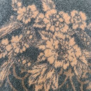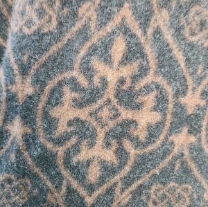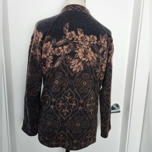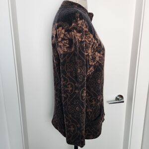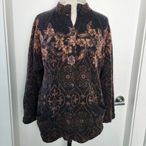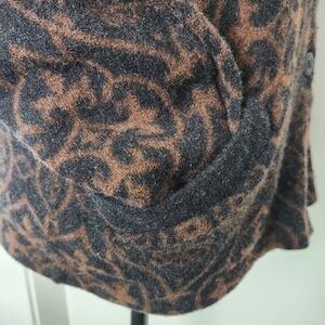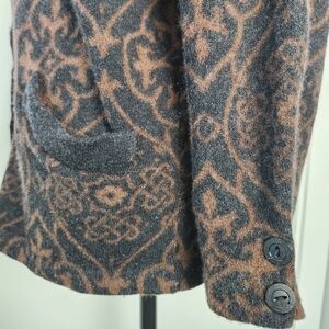 Rich black & golden brown gorgeous Dahlia Floral Damask Jacquard patterned wool Knit button front Cardigan Sweater Coat with front patch Pockets, by Unknown (educated guess = Rodier Paris).
