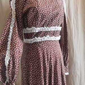 70s Prairie Dress With Daisy Print Brown Cotton Fabric Lace full skirt festival
