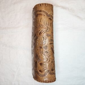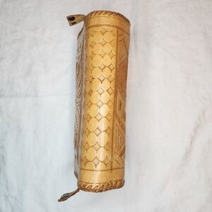 Dark brown patina embossed flowers, light tan leather cactus flower and Myan temple, side buttons, multi pockets, Astro zipper, brass toggle closure, Great Vintage Condition, one brass ring is missing, has two hand straps in not great condition, brand new adjustable faux leather shoulder strap included.