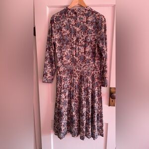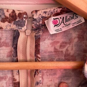 Has a drop waist with a pleated skirt. Belt loops to add a thin belt if desired. Back zipper.
