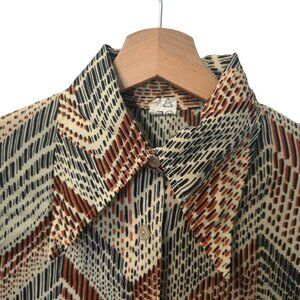 Colour: Cream/Orange/Black Brand: Unknown/Vintage Size: S/M - Measures 21" across the bust Fabric: 71% Triacetate/27% Polyamide Style: Button up blouse, pointed collar Sleeve Length: Long
