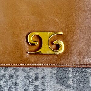 70s vintage saddle coloured leather with gold hardware flap shoulder bag. No label, has one large main flap compartment, two open smaller side pockets, one small zippered pocket inside. Has marks as shown. Measures 11.5 inches long, 6 inches tall, 3 inches wide, strap drop is 15 inches. Cat friendly, nonsmoking home.