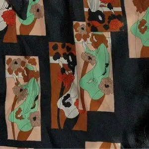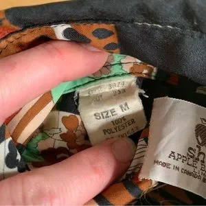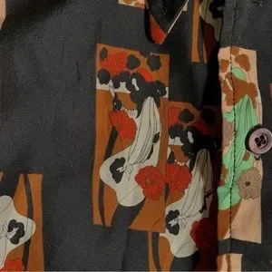 70’s polyester Art Deco print button down shirt with a swallowtail collar.