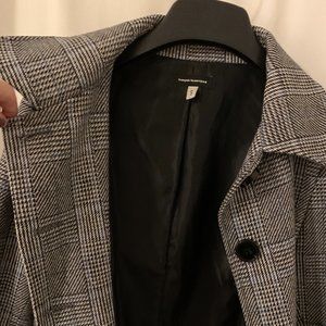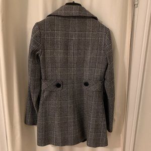 70s inspired peacoat that is 100% wool and fully lined. The plaid has a little bit of blue in it which brightens the grey and black.