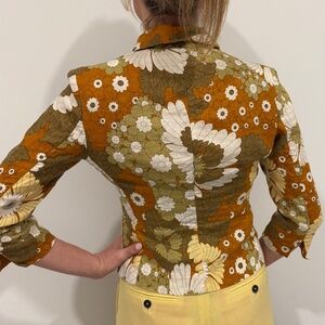Women’s XS Retro Yellow Floral 70s Short Jacket 100% Linen fabric. It has shoulder pads under the lining to give the soft relaxed fabric a stylish fit. Great condition only worn a few times.