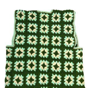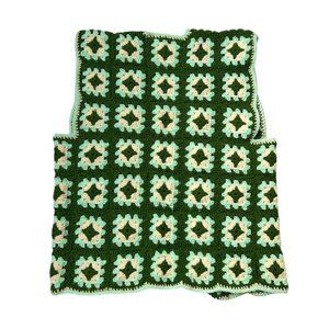 Lightweight acrylic material; green and beige granny square pattern