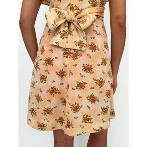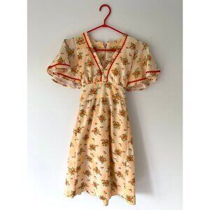 this lovely handmade peachey-pink floral printed dress from the 70s is one-of-a-kind and ready to turn heads! the dress features a V neckline, short ruffle-y flutter sleeves, a gathered bust and a fitted empire waistline with belt loops and a long back tie. the dress has an above-knee mini length and it fastens at the back with a long metal zipper and hook and eye (although the “eye” is not a metal piece, it is just threaded). the fabric is untagged but it feels like a lightweight polyester (slightly see through) and is unlined. the contrast red ric rac trimming around the neckline and sleeves is a cute added detail!