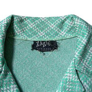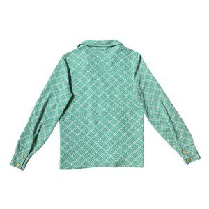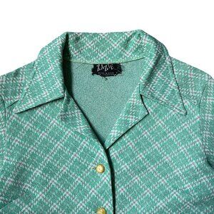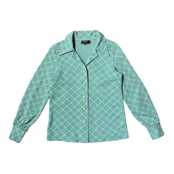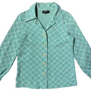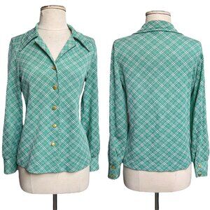 70s vintage plaid pointed collar blouse green notched dagger long sleeve button.