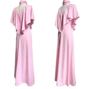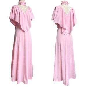70s vintage victorian maxi dress Cape Sleeve lace cutout cottage high collar.