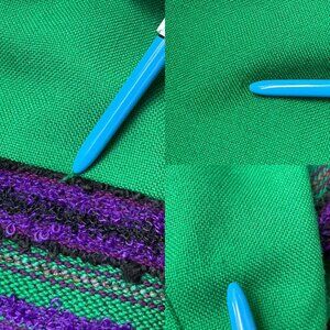 100% wool, green; textured purple detailed band at hem; nylon lining