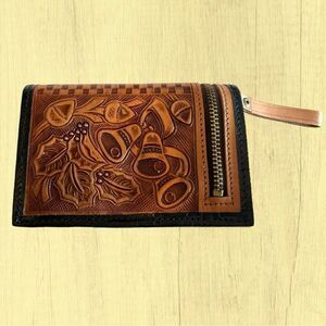 Gorgeous vintage 70s tooled leather wallet. Deer motif on one side and acorns on the other. Lots of zippers and a coin purse as well as a little mirror. The brass claps is oxidized, but otherwise great vintage condition. 3”x5”