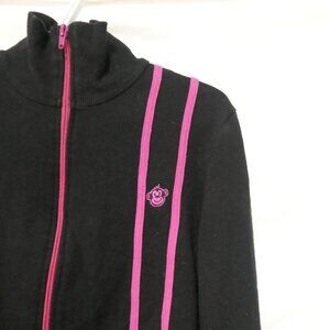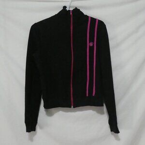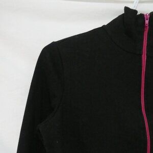 A stylish black zip-up exercise jacket with pink stripe details on the front