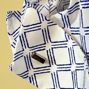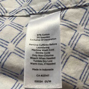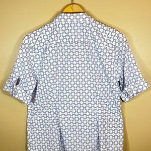 This Talbots 'Non-iron Perfect Shirt' is a beloved wardrobe staple, featuring a white base with a blue design. It has short sleeves with folded cuffs and silver cuff link details. It has 8 hidden buttons and is made from 97% Cotton and 3% Spandex. This versatile shirt can be worn to the office under a suit or on the weekend with a pair of jeans, capris, or shorts. Measures approximately 20 inches from armpit to armpit. This shirt is in excellent condition and looks brand new!