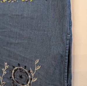 Stylish denim mini dress with colorful embroidery. Features pink and black floral designs. Ideal for casual wear.
