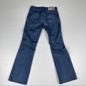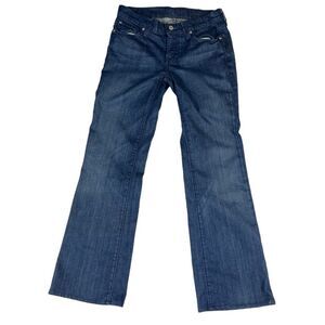 7 For All Mankind Jeans Flip Flop Dark Wash Flare Cut, Rhinestone/Crystal Paint Splatter Patch. Women's 25 HEMMED. These jeans have some stretch. Made in the USA. Good used condition.These jeans have been hemmed - Please see photos for approximate measurements.