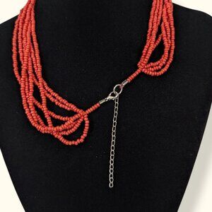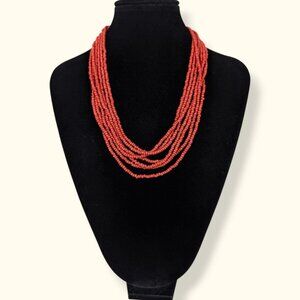 This necklace has 7 beaded strands and has an adjustable lobster clasp closure made of a silver tone metal. The strands all are all strung with red/orange coral tone seed beads. While I've seen seed beads made of actual coral, these appear too consistent and uniform, and suggest they're not coral. Still, the colour is rich and the necklace is comfortable to wear. There is normal wear, but no issues affecting wearability.
