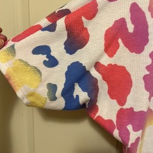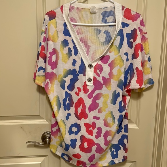 Multicoloured animal print top made of 100% polyester. V-neck button slightly oversized t-shirt. Slightly longer front. Very comfy, flowy and breathable material. Size M.
