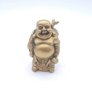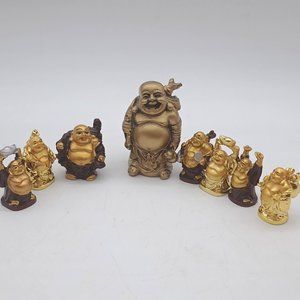 8 resin Buddha statues in various poses. They are mostly in a golden color with some in red as well. They are made of resin and for reference the largest statuette is 3 3/4" tall by 2 1/4" wide.
