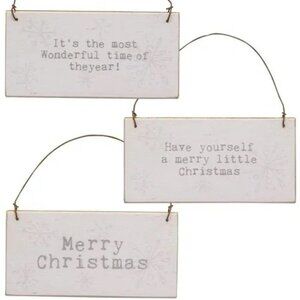 The Merry Christmas Mini Snowflake Ornaments are an assortment of three wooden sign ornaments with a distressed white finish. The ornaments feature Christmas messages in a gray typewriter-style font, reading “Merry Christmas”, “It’s the most wonderful time of the year!”, and “Have yourself a merry little Christmas”. Each ornament comes equipped with a black wire hanger, making these signs the perfect wintry addition to a Christmas tree, on knobs, or even gifts during the holiday season. Each measure 1.75” high by 3.5” wide.