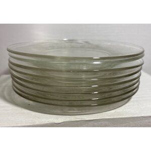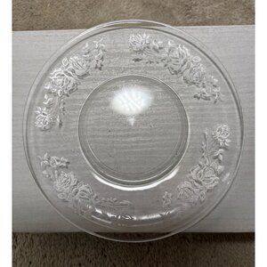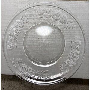 This set of 8 clear glass plates features a detailed floral rose etching, offering a timeless elegance suitable for formal dining or decor.