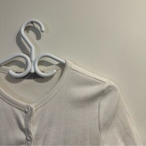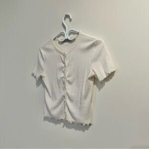 Stylish white button-up top with short sleeves. Perfect for casual wear.