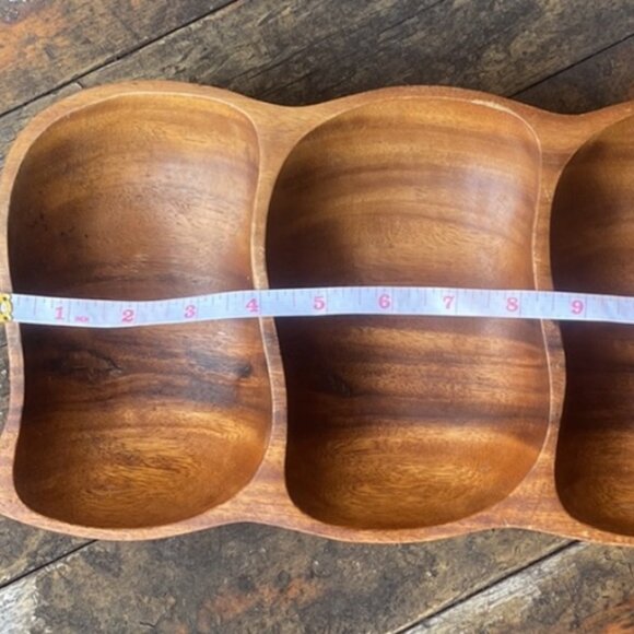 This vintage 4 compartment monkeypod wood serving dish is in excellent condition. The separate compartment feature allows you to serve with separation in mind. The dark on light wood grain bring an elevated level of luxury to this piece. A great gift for that collector or vintage lover.