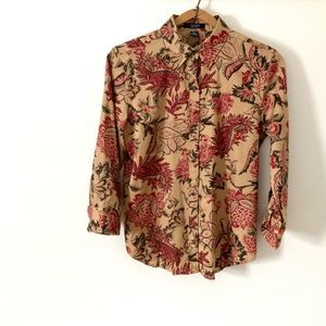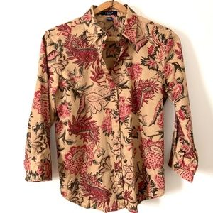 Cotton Chaps blouse in a paisley floral print. Very Ralph Lauren style. The base colour is a taupe beige with red green pink and brown in the pattern. Three quarter length loose sleeves. Button front with a small collar. No damage.