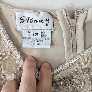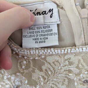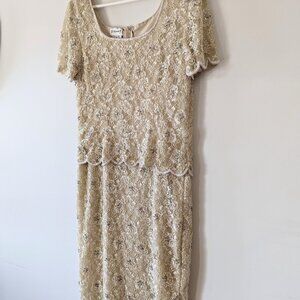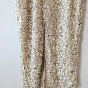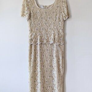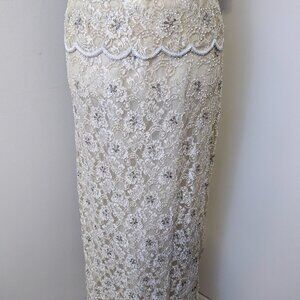 Lovely beige beaded formal gown vintage from the 1980s! This beautiful dress has a floral lace pattern with intricate beading throughout. It has a zip-up back and gorgeous lace hem. It is in excellent condition!