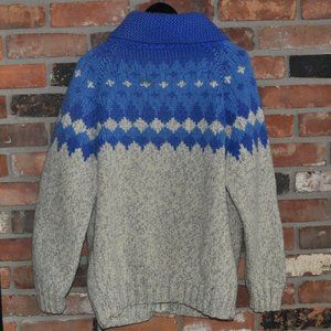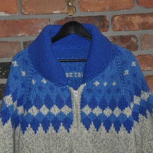 80s Blue & Grey Gray 100% WOOL KNIT Zip-Up Heavy Cardigan Sweater Apres Ski L