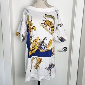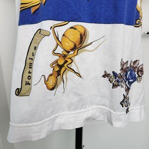 Vintage 80s, Made in Italy, Blue & Gold, dragonflies, beatles, scroll work, flowers, wheat, Good Condition, has some flaws (see photos), Oversized M, fits more like a loose L, Pit-24, Neck-19, Length-32.