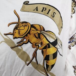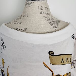 Designer White Cotton Flora & Fauna Graphic Print short sleeve Tshirt with wide off-shoulder Boatneck, "Formica Apis" (Bees & Ants) by BYBLOS.