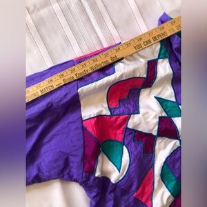 Vibrant windbreaker with colour block and geometric patterns. Features purple, pink, teal, and white colours. Perfect for a bold look. Lined with a white tee shirt like material.