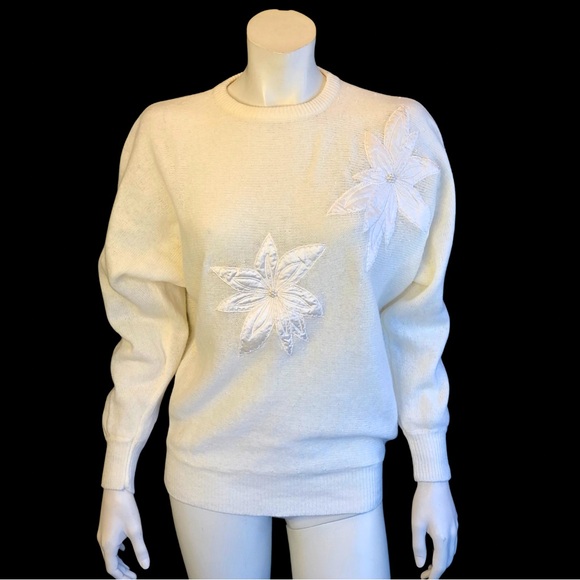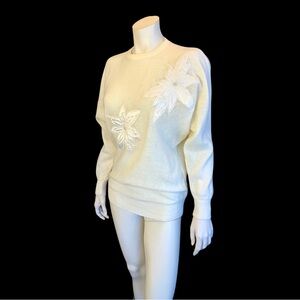 Ivory Winter White Knit Sweater with 2 Satin POINSETTA Appliqués.