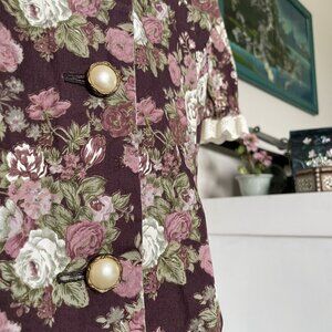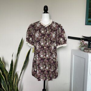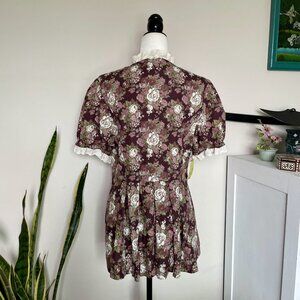 This hand-made little number can double as a tunic top or a mini dress. Relaxed fit. Features a slightly washed-out bordeaux and cream floral pattern, and large pearl buttons. The puffy fairy arms and neckline are decorated with an off-white frilly lace, giving the piece an overall southern belle feel. The garment is also slightly longer in the back with pleating to accentuate one's figure.