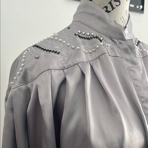 80s Gray Satin Blouse with High Collar and pearls rhinestones details