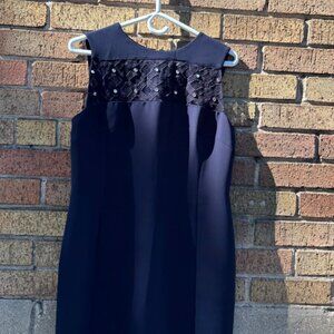 Refined navy sleeveless dress by Evan Picone featuring a bejeweled geometric lace overlay at the bodice. Polished yet eye-catching, ideal for formal dinners and special events.