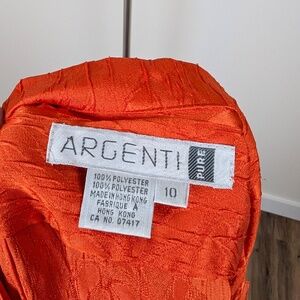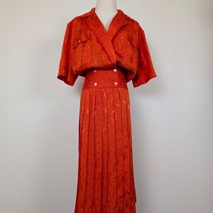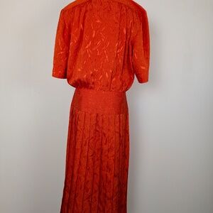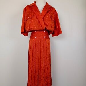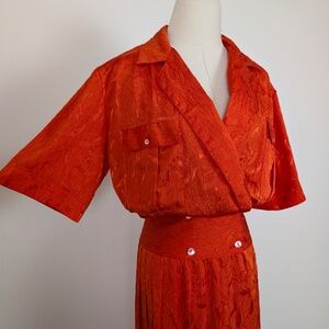 80s Orange Midi Dress Drop Waist Peplum Doubled Breasted Collar V-Neck