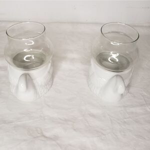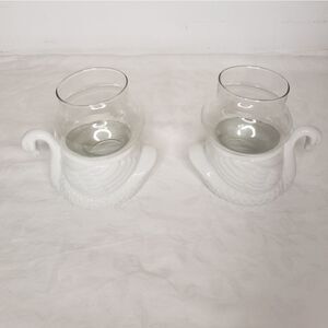 2 Whimsical white Ceramic Porcelain Swan candle holders with glass votive toppers.