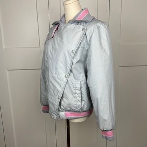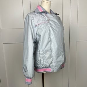Epic 80's ski jacket, light grey with pink and white details, has some staining on the sleeve and a faint mark on the front ( shown in images) Selling as is.