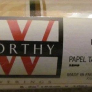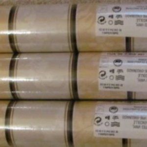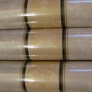 This is a really fabulous wallpaper. It's got a rich, mustard gold, camel and olive green coloring in a stripe and brocade floral pattern. Reminds me of a cross between art deco and Tuscan style. Each roll, labeled "Sunworthy", made in England, is pre-pasted vinyl. (Because of its age, I would probably still use paste.) Each roll measures 5.2 metres squared or 56 sq. ft and has a repeat of 26.5 centimetres. This listing is for all three rolls.