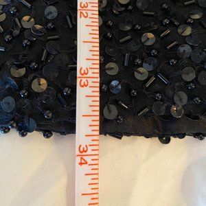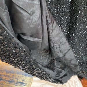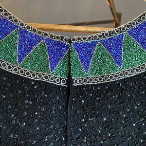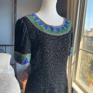 1980s vintage beaded and rhinestone cocktail dress, size 8. 100% silk dress with polyester lining. Black beads and rhinestones with blue, green and silvery gold triangular patterned collar and short sleeves. Had a good weight to it due to the glass beads. Zips at back. Excellent vintage condition, has a few beads missing from top collar but very hard to tell.