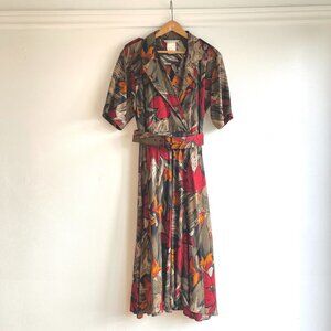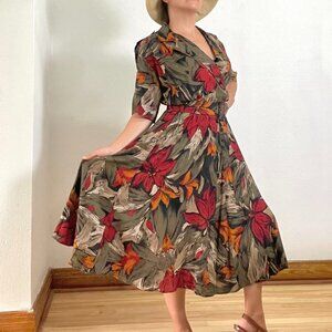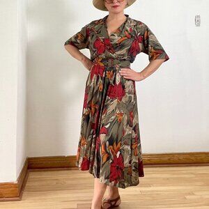 80s Vintage Safari Tropical Pattern Ballerina Length Dress