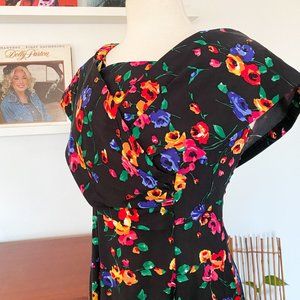 This dress brings some Miami heat! Vintage 80s Spanish style dress in black with bold and colourful floral print. I love the large band shoulder detail swooping to a deep v-back.