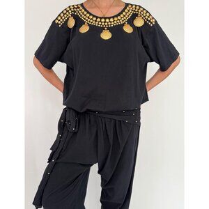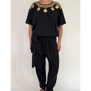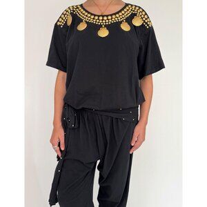 80s black embellished gold seashell retro loose cotton pant one piece jumpsuit