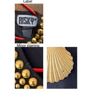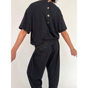 this is an incredible one piece jumpsuit by RISKY# from the late 80s or early 90s featuring a fully embellished front with decorative gold seashells and gold studding – such a statement vintage piece! the black jumpsuit features crew neckline, roomy short/half sleeves, an elastic waistband, and drop crotch harem pants that are slightly tapered. the garment has no shoulder pads (looks like they once had them but were removed), a four bronze button back closure, and it has an attached long waist tie with gold studded accents, and no pockets. the fit of the garment is loose and relaxed, and it cinches at the elastic waistband. the fabric feels like a soft pure cotton or cotton blend that is slightly sheer/see through, and it is unlined.
