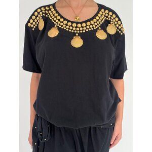 80s black embellished gold seashell studded funky loose cotton pant jumpsuit