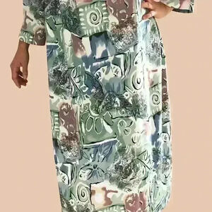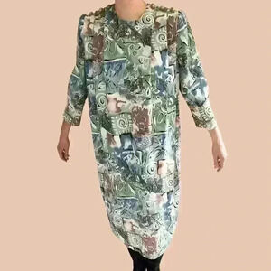Long vintage dress in pastel colours, accented shoulders with pearly ornate buttons. Excellent vintage condition